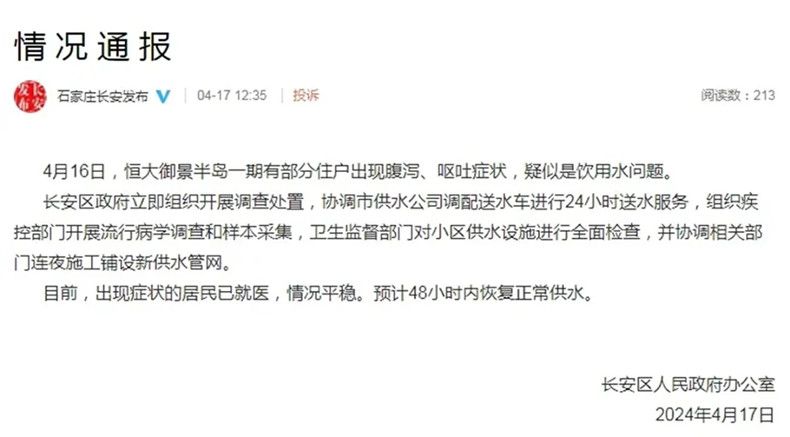 水是生命之源,人们的日常生活离不开水,提供给小区居民的自来水理应达到合格标准,但近日,据@石家庄长安发布微博发布通报,4月16日,河北石家庄恒大御景半岛一期有部分住户出现腹泻、呕吐症状,疑似是饮用水问题。长安区政府立即组织开展调查处置,协调市供水公司调配送水车进行24小时送水服务,组织疾控部门开展流行病学调查和样本采集,卫生监督部门对小区供水设施进行全面检查,并协调相关部门连夜施工铺设新供水管网。目前,出现症状的居民已就医。
